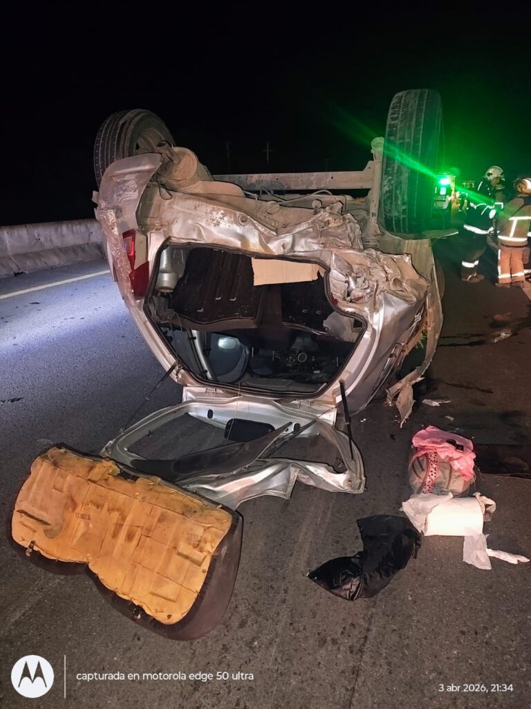 A raíz del accidente, el automóvil quedó tumbado sobre la carpeta asfáltica, con sus cuatro ruedas hacia arriba.