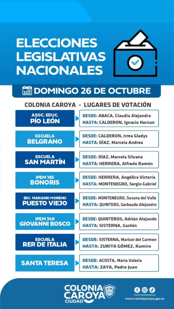 Los comicios se desarrollarán en distintos establecimientos educativos de la ciudad. Se recomienda a los vecinos consultar con anticipación su lugar de votación, ya que la distribución de las mesas puede variar respecto de anteriores elecciones locales o provinciales.