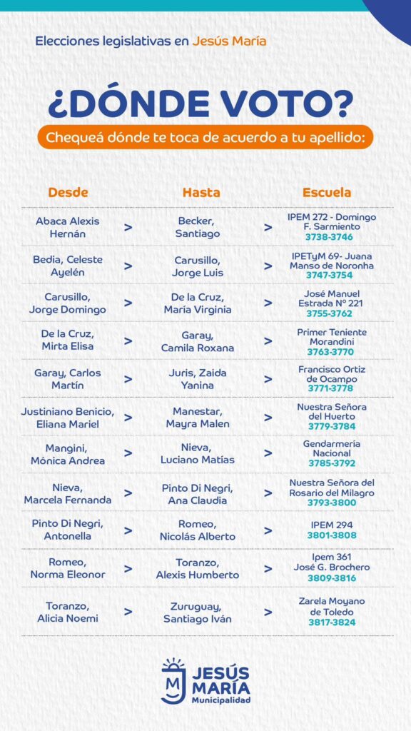 Este domingo se realizarán las elecciones legislativas 2025 en todo el país, con renovación parcial del Congreso y la implementación de la Boleta Única de Papel (BUP). En Jesús María y Colonia Caroya, los Registros Civiles abrirán con horario extendido. En Sinsacate se podrá votar en la Escuela Pringles. Conocé el establecimiento donde votás y preparate para los comicios.