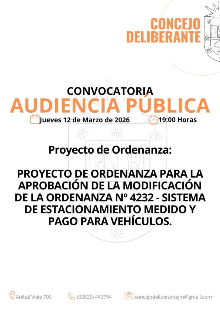 El Concejo Deliberante de Jesús María convocó a una audiencia pública este jueves 12 de marzo a las 19 horas, con el objetivo de modificar uno de los artículos de la ordenanza que regula el estacionamiento medido en la ciudad.