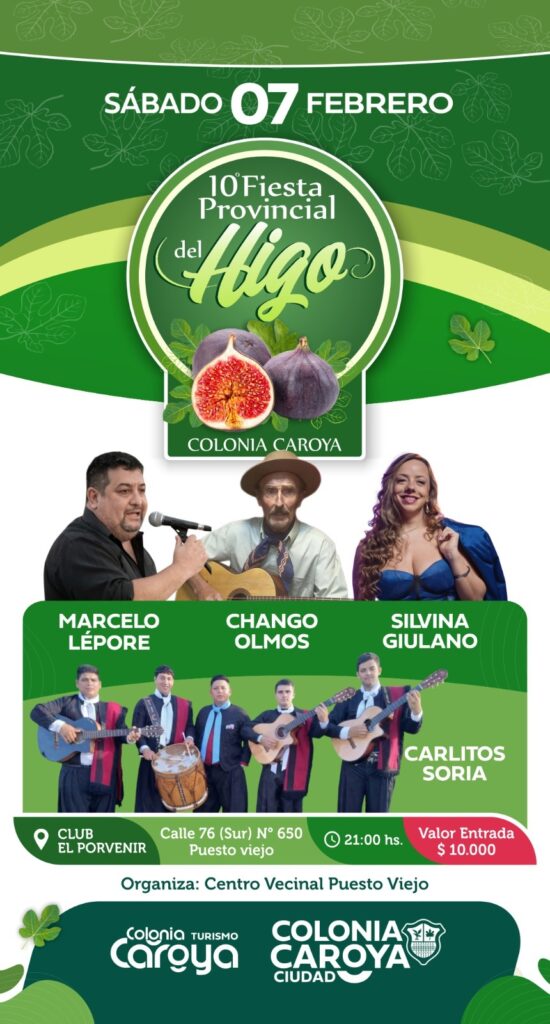 Este sábado 7 de febrero se realizará la 10° Edición de la Fiesta del Higo, con la actuación de Chango Olmos, Carlitos Sorias y dos espacios bailables, de la mano de Silvina Giuliano y Marcelo Lépore.