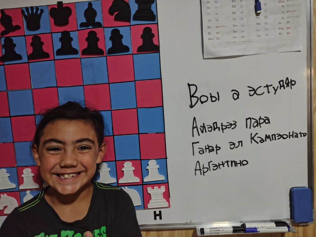Máximo junto a la frase “voy a estudiar ajedrez para ganar el campeonato argentino”, en el alfabeto ruso o cirilico.